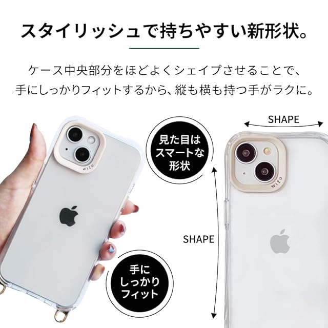 レザーケース<br>背面がレザー、フレームはレザーと同色のクリアでまとめたレザーとカラークリアの組み合わせが新鮮なデザインのケース。<br>素材には本革にも劣らない質感のフェイクレザーを使用。<br>高級感はそのまま、日常生活での水や汚れも気にせず手入れしやすい商品です。<br><br>ストラップパーツ付き<br>ケースの底部分に取り外し可能なストラップパーツ付き。<br>端末をケースから外した状態で、ワンタッチで簡単に着脱可能。<br>(パーツをつけるとき:ケースの内側から差し込む、パーツを外すとき:ケースの外側から押し出す)<br><br>耐衝撃・スタイリッシュな形状<br>ケースのフレームにはTPU素材を使用し、四つ角にボリュームを持たせたスタイリッシュなデザインを採用。<br>これにより、スマホが落下した際の衝撃を軽減し、同時に手にフィットする形状で握りやすさを向上させました。<br><br>レンズを保護するカメラフレーム<br>カメラフレームは、上品なアイボリーをベースにブランドロゴが入ったデザイン。<br>フレームの厚みがレンズよりもあるため、スマホを置いたり落下させた際に、レンズに傷がつきにくい設計です。<br><br>画面より高いフレームで画面保護<br>ケースフレームをスマホ画面よりも高く設計することで、落下時や机に置いた時の画面への傷つきを軽減。