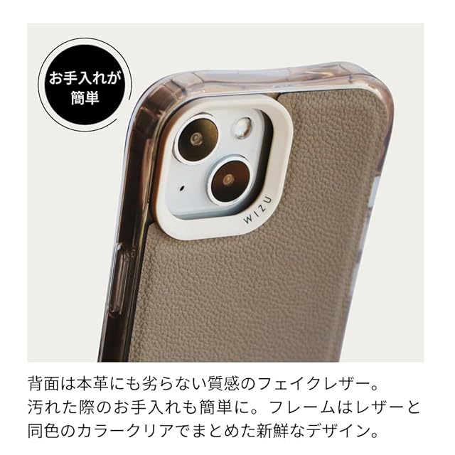 【レザーケース】背面がレザー、フレームはレザーと同色のクリアでまとめたレザーとカラークリアの組み合わせが新鮮なデザインのケース。素材には本革にも劣らない質感のフェイクレザーを使用。高級感はそのまま、日常生活での水や汚れも気にせず手入れしやすい商品です。
