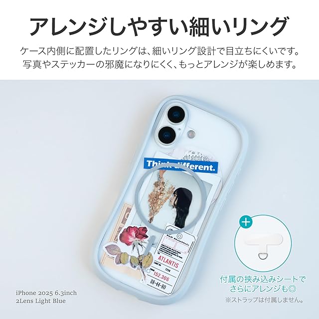背面に挟んだステッカーの邪魔になりにくい細いリング設計/衝撃を吸収するTPUと、硬く高透明なポリカーボネートのハイブリッドケース