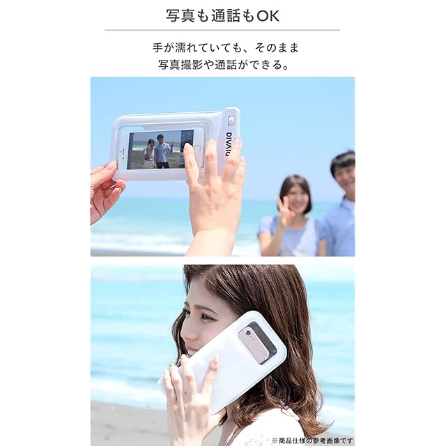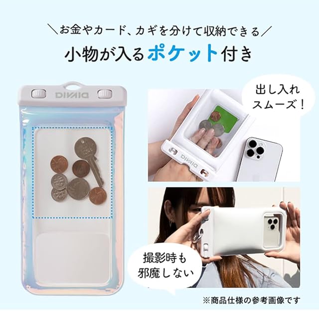 水のアクティビティは、防水ケース「DIVAID」でもっと楽しめる!水のレジャーに便利な防水ケース「DIVAID」に人気キャラクター「ちいかわ」デザインが登場!・花畑花畑を走るシーンを抜き出したデザイン。楽しそうな「ちいかわ」「ハチワレ」を見ていると、思わず一緒に駆け出したくなります。・約縦17×横8.5×厚1.2cm以下、重量約350gまでのスマホの収納OK・「IP68相当」の高い防水・防塵性能・小銭やカードが収納できるポケット付き・水面に浮いて紛失を防止・ケースに入れたまま画面操作・写真撮影・通話OK・ストラップの長さ調節OK・カラビナとネックストラップ付きで、カバンなどに付けたり斜め掛けにしたりスタイル自由・Face IDなどの顔認証にも対応・海水浴、プール、お風呂、アウトドア、音楽フェス、釣り、スキー、スノボ、雨の日など様々なシーンで大活躍●本製品ご使用における人体・スマートフォン本体を含む持ち物・データなどの損傷、損失、紛失に対し、弊社は一切の責任を負いかねます。●本製品をご使用になる前に、必ず本書記載の「装着方法」「浸水確認方法」に従い浸水がないことを確認してください。製品内部に水滴が確認された場合は、ただちに使用を中止してください。●装着するスマートフォン(静電容量式タッチパネル)の仕様上、画面に水滴が付着していたり多量の水が乗っている状態では操作できません。また、機器本体に画面保護フィルム等を貼った状態ではご使用できない場合があります。●ホームボタンのあるiPhoneの場合はボタンが反応しなくなるため、「Assistive Touch 機能」を設定してご使用ください。*[設定]→[アクセシビリティ]→[タッチ]→[AssistiveTouch]をオンOSバージョンによって設定手順が異なることがあります。●本製品の浮力目安は約350gです。スマートフォン重量によっては水に浮かない場合があります。●ご利用状況・環境、溶剤の使用などにより変色や変質が起きることがあります。●小さな部品がありますので誤飲にご注意ください。●本製品およびパッケージは改良のため予告なく仕様を変更する場合があります。●記載されている製品名・会社名などは各社の商標または登録商標です。本体:約縦23×横11.5×厚1.7cmストラップ長:最短約74cm~最長約135cmカラビナ:約縦6.1×横2.9×厚0.5cm重量:約65g主素材:ABS、PVC、ナイロン、アルミニウム、スチール防水・防塵性能:IP68対応画面サイズ:約縦16.6×横7.7cm以下収納可能サイズ:約縦17×横8.5×厚1.2cm以下耐水温度:0℃~45℃浮力目安:約350g