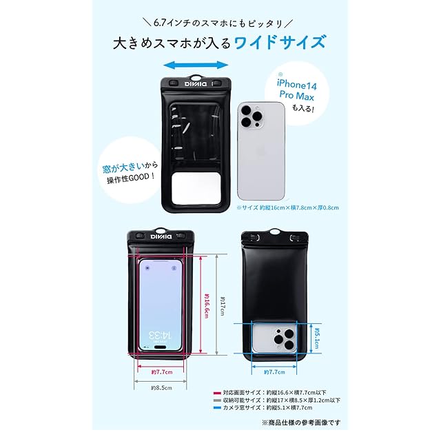 約縦17×横8.5×厚1.2cm以下、重量約350gまでのスマホの収納OK・「IP68相当」の高い防水・防塵性能・小銭やカードが収納できるポケット付き・水面に浮いて紛失を防止・ケースに入れたまま画面操作・写真撮影・通話OK・カラビナとネックストラップ付きで、カバンなどに付けたり首からかけたりスタイル自由・Face IDなどの顔認証にも対応・海水浴、プール、お風呂、アウトドア、音楽フェス、釣り、スキー、スノボ、雨の日など様々なシーンで大活躍