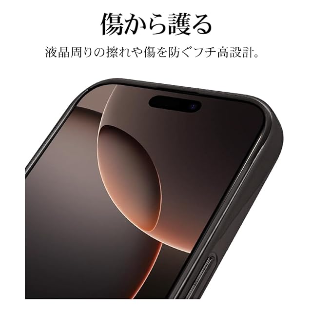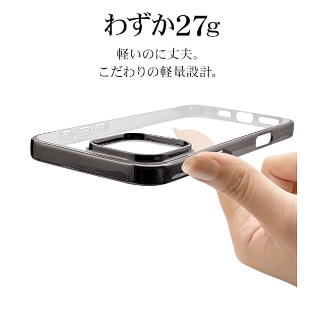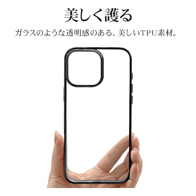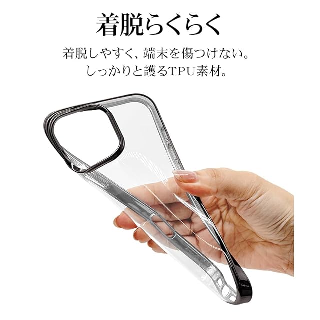 本製品は滑りにくくしなやかなTPUメタルフレーム背面ケースです。 滑りにくくしなやかな耐衝撃性のあるTPU素材で、側面と背面をしっかりカバーし優しく端末を守ります。 ※衝撃吸収については、一般的なポリカーボネート製ケースと比較した自社検証結果で、無破損、無故障をするものではありません。 保護性能と装着感を追求した約1.2mmの厚めのデザイン。 やわらかい素材を使用しているため着脱が簡単です。 ケースをつけた状態でワイヤレス充電器による充電が可能です。 ※全ての環境で動作をするものではありません。またMagSafeアクセサリの固定には対応しておりません。 チャーム等を取り付けることが可能なストラップホール付き。 ※本製品のストラップホールを使用する場合は、ストラップのみで宙吊りにするご使用方法はお止めください。 ケースから機器本体が外れて落下し破損や損傷等の原因となります。 ケースを装着したままカメラ機能や充電コネクターの接続、タッチパネル操作が可能です。 また各種ボタンの操作も使用可能です。 画面を伏せて置いてもディスプレイが直接当たりにくい形状です。 ※本製品は液晶ガラスの外周まで覆う形状の為、保護フィルム等の形状によっては浮く、もしくは剥がれてしまう場合があります。 対応ガラス・フィルムをご使用の際はご注意ください。 ※ご使用のモニター環境により、実際の商品の色合いと多少異なってみえる場合がございますのでご了承ください。 ※商品及びパッケージは改良などの諸事情により予告なく変更することがあります。