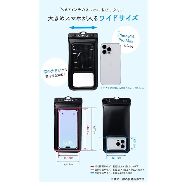 約縦17×横8.5×厚1.2cm以下、重量約350gまでのスマホの収納OK / 「IP68相当」の高い防水・防塵性能 / 小銭やカードが収納できるポケット付き / 水面に浮いて紛失を防止 / ケースに入れたまま画面操作・写真撮影・通話OK / カラビナとネックストラップ付きで、カバンなどに付けたり首からかけたりスタイル自由 / Face IDなどの顔認証にも対応 / 海水浴、プール、お風呂、アウトドア、音楽フェス、釣り、スキー、スノボ、雨の日など様々なシーンで大活躍