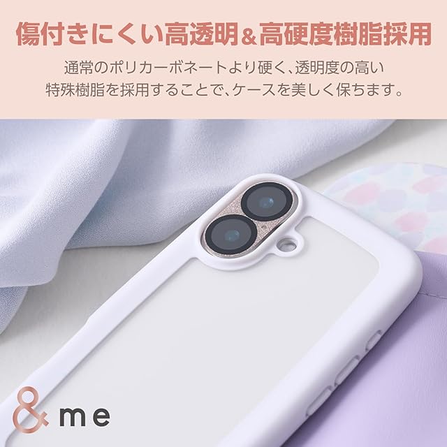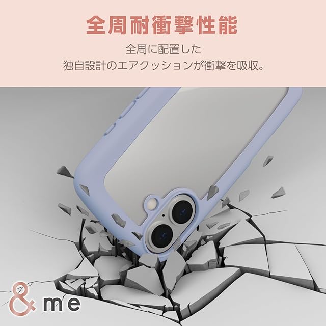 全周に配置した独自設計のエアークッションが衝撃を吸収し、背面には高硬度のポリカーボネート素材を採用した、フレームがぷっくりと丸い&meシリーズのハイブリッドケースです。