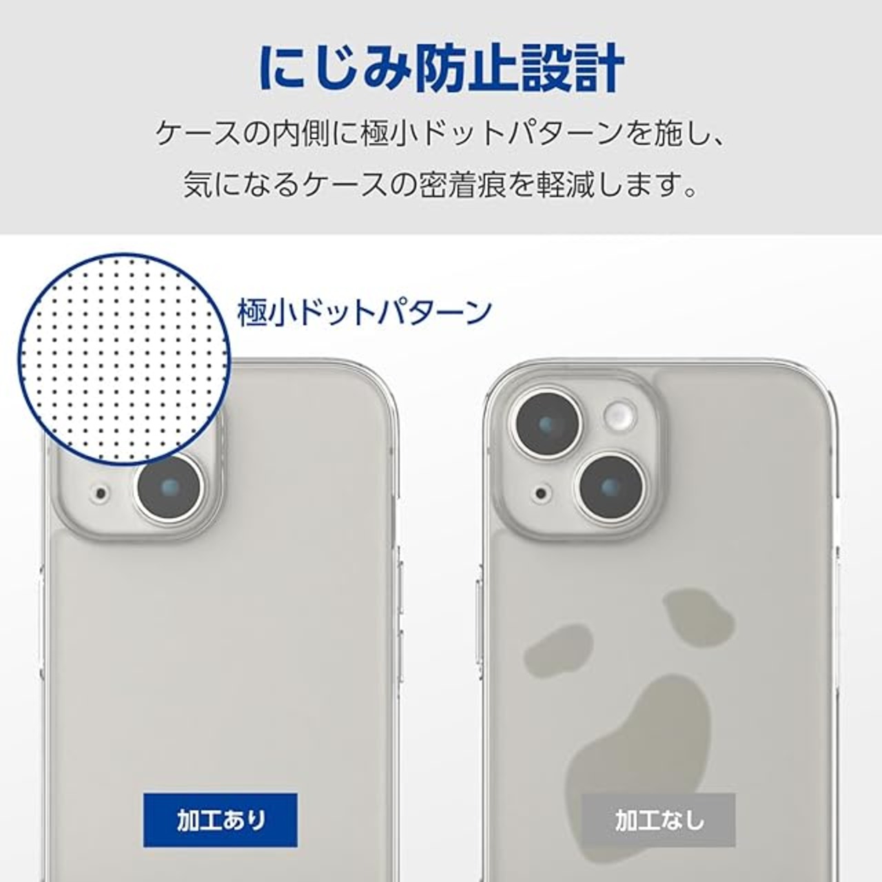 ケースと端末の貼り付きを防止するため、ケース内側にマイクロドット加工を施しています。