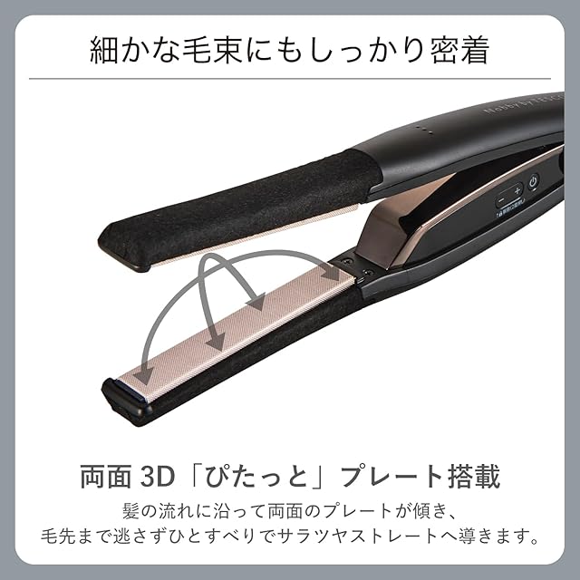 両面3D「ぴたっと」プレート搭載。髪の流れに沿って両面のプレートが上下左右に傾いて、細かな毛束にもしっかり密着。毛先まで逃さず、ひとすべりでサラツヤストレートへ導きます。