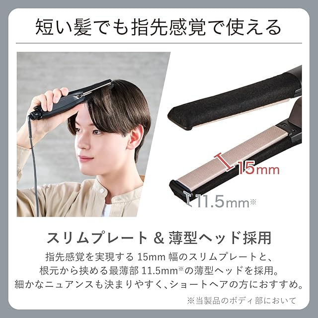 髪ダメージを気にせず、指先感覚で簡単アレンジ。シルクコーティング(TM)で髪のうるおいを守り、ヘアカラーをキープするアレンジアイロンです。幅15mmのスリムプレートだから、ショートヘアのスタイリングにぴったり。ツイストやウェーブなどのニュアンスもしっかり決まります。プロが使用するサロンブランド『Nobby』をモデルに開発されたモデルです。
