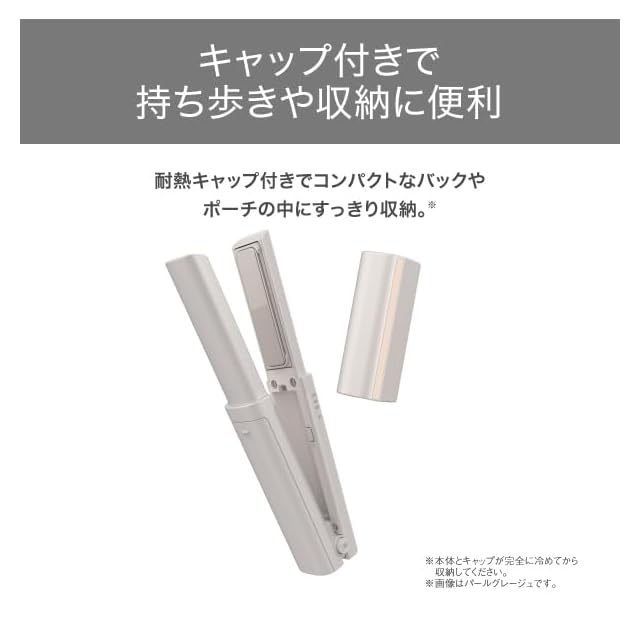 <b>【 仕様 】</b><br>■サイズ:高さ / 35mm 幅 / 192mm 奥行 / 34mm (本体のみ、収納時)、高さ / 70mm 幅 / 189mm 奥行 / 34mm (本体のみ、使用時)<br>■質量:180g(本体のみ)、200g(キャップ付き)<br>■消費電力:-<br>■電源:DC5V 2A(充電時)<br>■スイッチ:スイッチ(電源 ON/OFF/温度切替(210℃/190℃/160℃))<br>■プレートサイズ:幅 / 17mm 長さ / 64mm<br>■温度表示:印刷+LED表示<br>■温度調節幅:210℃/190℃/160℃<br>■温度ロック機能:×<br>■温度メモリー機能:×<br>■立ち上がり時間:約30秒(最高温度設定時100℃到達時間)<br>■搭載イオン:-<br>■海外使用:○<br>■自動電源OFF機能:○<br>■開閉ロック機能:○<br>■ラク抜きプラグ:×<br>■付属品:耐熱キャップ/充電池/充電ケーブル USB(Type A) 本体側(Type C)<br>■カラー:メタリックグレー<br>■ケーブル長:1m<br>■パーツ:USBコード(TA033109)、キャップ(TA033116)、充電池(TA033086)、充電池カバー(TA033130)<br>■期間:1年間<br><br><b>【 説明 】</b><br>■電源コードがないため、化粧室や学校、職場、アウトドアなど、どこでも気軽にお使いいただけます。<br>■耐熱性キャップ付きで、外出先でもサッとしまえます。※ コンパクトなバックやポーチの中にもすっきり収納でき、持ち歩きに便利です。 ※本体とキャップが完全に冷めてから収納してください。<br>■髪の流れに沿って両面のプレートが上下左右に傾いて、細かな毛束にもしっかり密着。外出先でもきれいなスタイリングを叶えます。<br>■プリントヒーター搭載で、コードレスでありながら高いプレート温度と立ち上がりの速さを実現しました。求める仕上がりに合わせて、210℃/190℃/160℃の3段階で温度を設定できます。スピード立ち上げ約30秒※で、外出先でもスムーズにスタイリングを始められます。 ※100℃到達時間(最高温度設定時)<br>■〈髪すべりが良いナノセラミックコーティング〉 なめらかな髪すべりで、ムラなく熱を伝えます。〈海外使用OK※〉 航空機内には電池を本体から外して手荷物として持ち込めます。 ※航空機で持ち運ぶ際は、必ず電池を本体から取り外して、機内持ち込みの手荷物に入れてください。〈自動電源OFF〉 万が一電源OFFを忘れても、最終操作後約15分後に自動的に電源が切れるので安心です。〈電池残量表示〉 充電残量が少なくなると点滅でお知らせします。2時間半の満充電で約25分使用可能です。※ ※充電には電源定格(5V2.0A以上)のACアダプター・モバイルバッテリーなどが別途必要です<br>■充電池と充電ケーブル(USB:TypeA/本体側:TypeC対応)が付属します。 <br>■コスメのようなフォルムと、スタイリッシュで高級感あるデザインにこだわりました。品を感じるパールグレージュと、シックなメタリックグレーの2色展開です。<br><br><b>【商品に関するお問い合わせ】</b><br>ホームページよりご確認ください