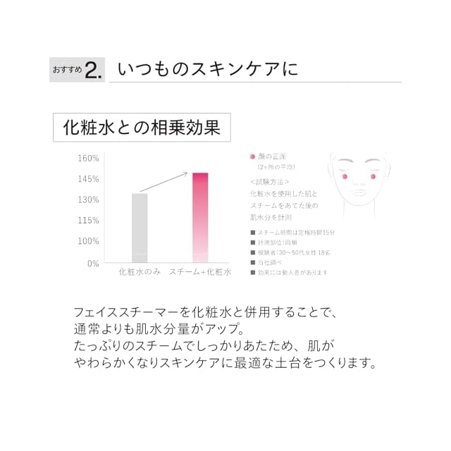 【いつものスキンケアに】化粧水だけでスキンケアをするよりもフェイススチーマーと併用することでさらに肌水分量がアップ。 たっぷりのスチームでしっかりあたため、肌がやわらかくなりスキンケアに適した土台をつくります。