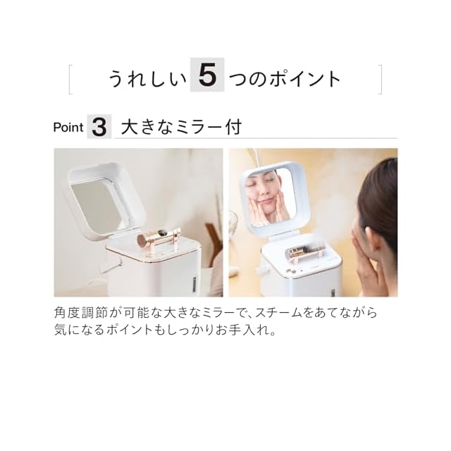 【大きなミラー付き】角度調節ができる大きなミラーで、スチームをあてながら気になるポイントをしっかりお手入れできます。