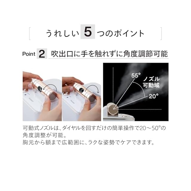【吹出口に手を触れずに角度調節可能】可動式ノズルは、ダイヤルを回すだけの簡単操作で20〜55°の角度調節が可能。胸元から額まで広範囲に楽な姿勢でケアできます。