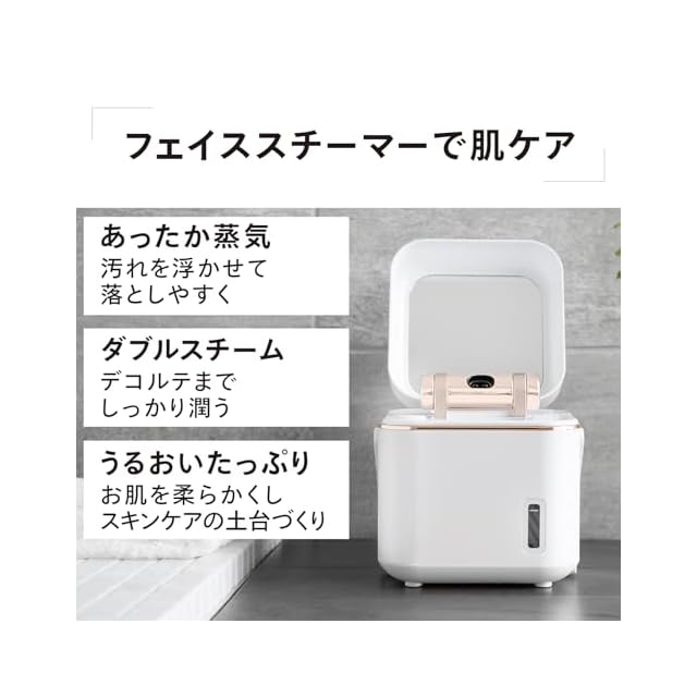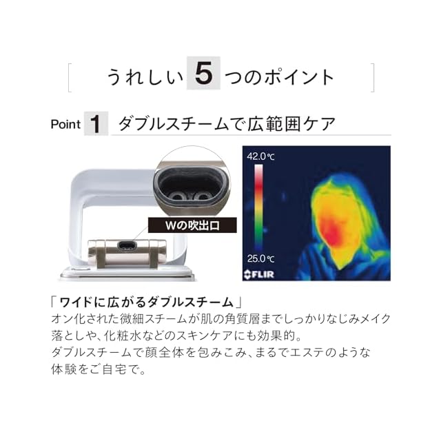 【ダブルスチームで広範囲ケア】イオン化された微細スチームが肌の角質層にまでしっかりなじみ、メイク落としや化粧水などのスキンケアにも効果的。ダブルスチームで顔全体を包み込む、まるでエステのような体験をご自宅でどうぞ。