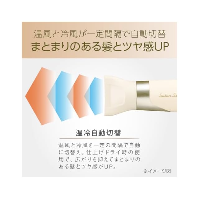温冷自動切替:温風と冷風を一定の間隔で自動に切替え。仕上げドライ時の使用で、広がりを抑えてまとまりのある髪とツヤ感がUP。