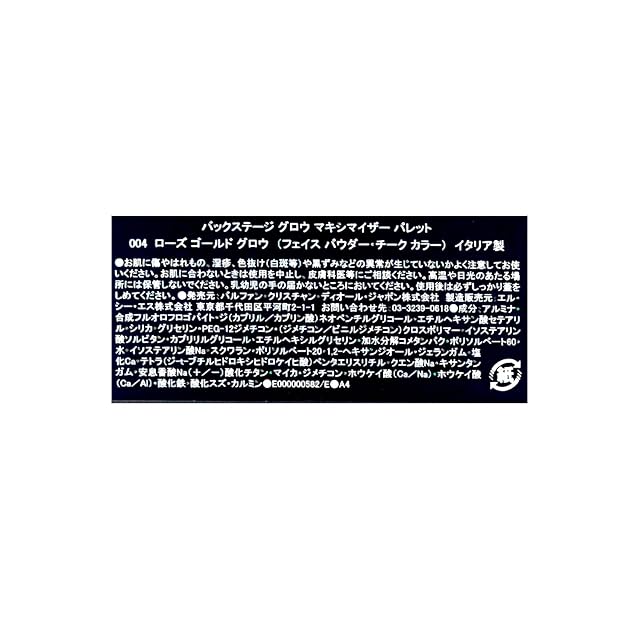 ブランド<br> Dior(ディオール)<br><br> 成分<br> 画像参照<br><br> 内容量<br> 10g<br><br> カラー<br> 01 ユニバーサルグロウ<br> 02 フロステッドオパールグロウ<br> 03 パーリーピーチグロウ<br> 04 ローズゴールドグロウ<br><br> 付属品<br> ショップバッグ<br><br> 品番<br> バックステージ グロウ マキシマイザー パレット<br><br> ※カラーの見え方につきま しては、お客様のモニターなどの設定により、違って見える場合がございます。 <br> ※入荷時期により商品やパッケージの仕様が一部変更となる場合がございます。<br>