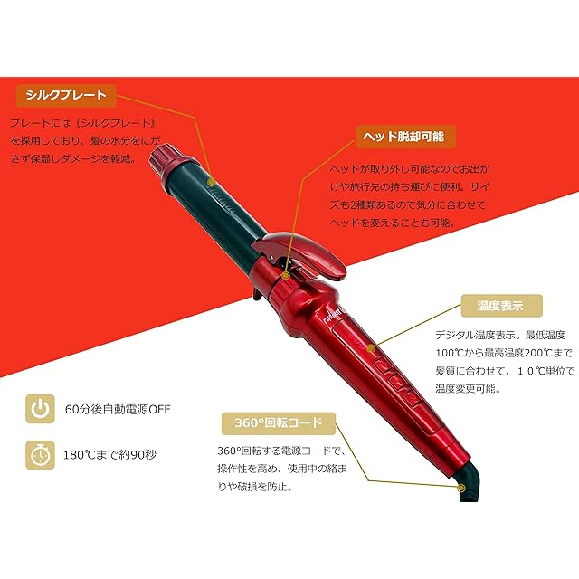 業界初の革新技術シルクプレートを採用したカールアイロン! 摩擦力の最も少ない特殊なテフロン系シートを施し、唯一無二の滑らかさと水分蒸発を極限まで抑える保湿力で髪を美髪に導きます。 髪の毛の中の水分を保持し、艶やかなカールを長時間キープします。 ヘッドが脱着可能でカールサイズが変えられてスタイリングも思いのままに。 ヘッドが外せるのでコンパクトになり持ち運びがラクラク!