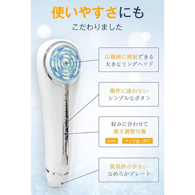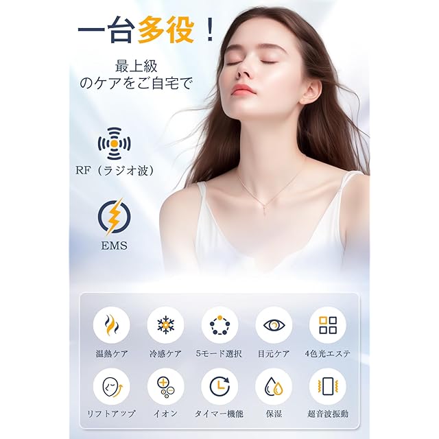 【多機能美顔器・革新テクノロジー搭載】本製品は多機能RF光美容器です。低中高周波、RF機能、EMS微電流などの革新的なテクノロジーを搭載して、緋/赤/オレンジ色/青色LEDを組み合わせて、目元ケア、浸透/導入、RF、たるみ、冷感の機能があります。お自宅でも毎日のひと工夫で憧れの完美な肌を1台で実現します!自宅でエステを実現できます!