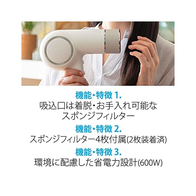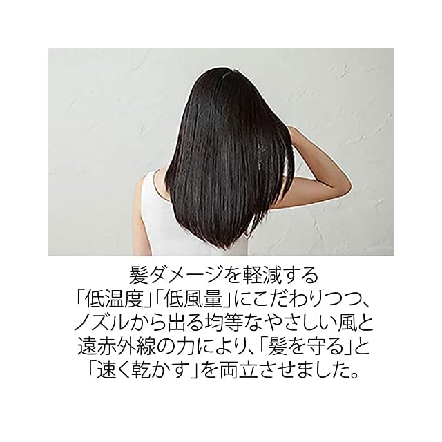 【「髪を守る」と「速く乾かす」を両立させました。】独自開発した「十字形ワイドノズル」と遠赤外線を発生させる「ケアフィルター」を搭載。 髪ダメージを軽減する「低温度」「低風量」にこだわりつつ、ノズルから出る均等なやさしい風と遠赤外線の力により、「髪を守る」と「速く乾かす」を両立させました。