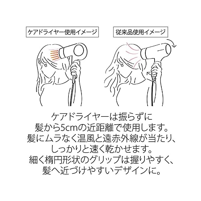 【腕の疲れを感じにくいデザイン】ケアドライヤーは振らずに髪から5cmの近距離で使用します。従来品と比べ、近づけて振らずに乾かすので、髪にムラなく温風と遠赤外線が当たり、しっかりと速く乾かせます。細く楕円形状のグリップは小さな手も握りやすく、髪へ近づけやすいデザインに。