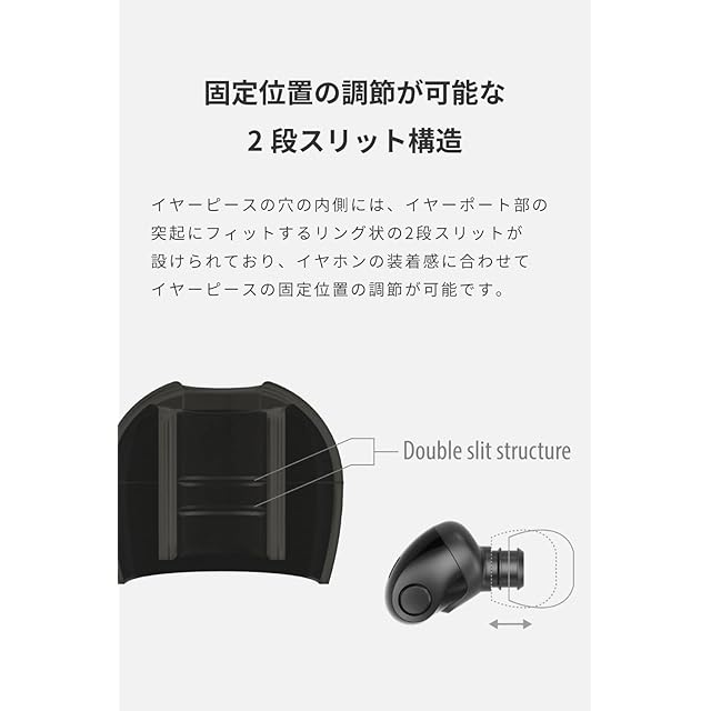 【位置調節が可能な2段スリット構造】イヤーピースの内壁に、イヤホンのポート先端の突起にフィットするリング状の2段スリットを設けました。イヤホンの装着感に合わせてイヤーピースの固定位置の調節が可能です。