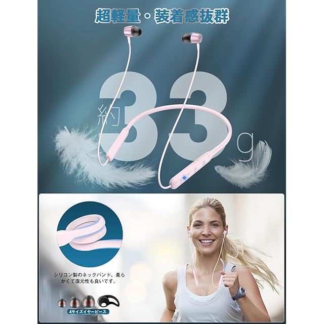 【シリコン製のネックバンド・装着感抜群・マグネット搭載】体に触れる部分が多いネックバンド型イヤホンでは、つけ心地のよさを重視しましょう。弊社のネックバンドは柔らかいシリコン素材で首回りへの圧迫感が少なく良好なフィット感が得られます。ランニング時の使用や長時間使用でも外力に対して変形しにくく、耳から外れにくい構造を実現しました。さらに耳の形は人によってさまざまで、耳に入れるイヤーピースのつけ心地も重要。そのため、交換用のイヤーピースが4セット(S、M、L、M′)を付属してご適用のサイズを選択してください。圧力を削減するため、本体の重さは約33gで軽量設計されているため首にやさしいです。マグネット搭載するので、使わない時はイヤホンを外しても首にひっかけたままにしておけるので紛失防止にも役立ちます。コードが邪魔になりにくいのでおすすめです!