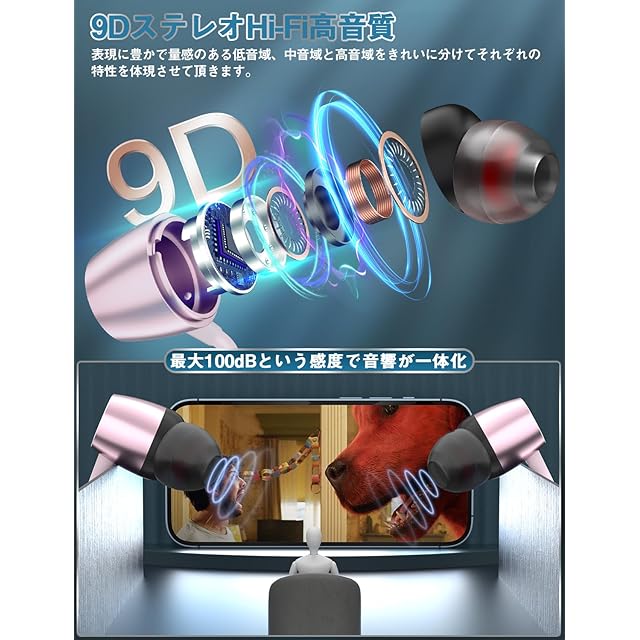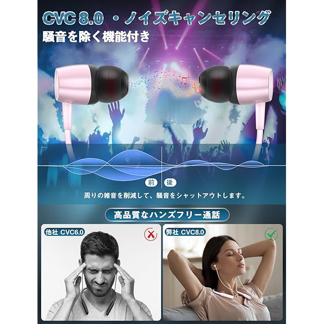 【Hi-Fi高音質・9Dステレオサウンド・CVC 8.0ノイズキャンセリング】複合鼓膜ダイナミックドライバーを備えており、AACとSBCコーデックも対応するのでーデックとはオーディオ機器からイヤホンへ音楽を伝送して、音声データを圧縮する方式で高品質なコーデックになって、コンサートのように、臨場感あふれる9Dステレオで、低遅延・高音質を実現できます。また、CVC 8.0ノイズキャンセリング技術により、よい遮音性で周りの雑音を適度にカットし、繁華街や駅構内、飛行機や電車内等うるさい場所でも、周囲の環境音に左右されることなくクリアな音楽視聴や通話をサポートしてくれます。イヤホンには指向性のマイクが内蔵されていて、周囲のノイズをカットしてくれ、ハンズフリー、クリアな通話にも対応しています。
