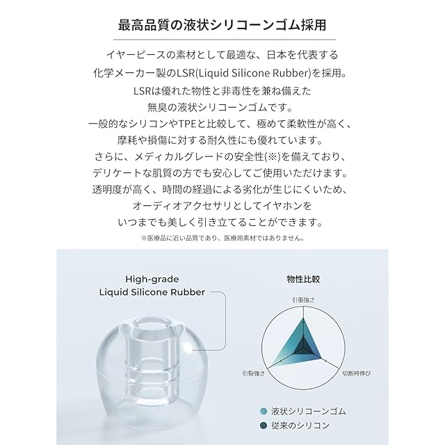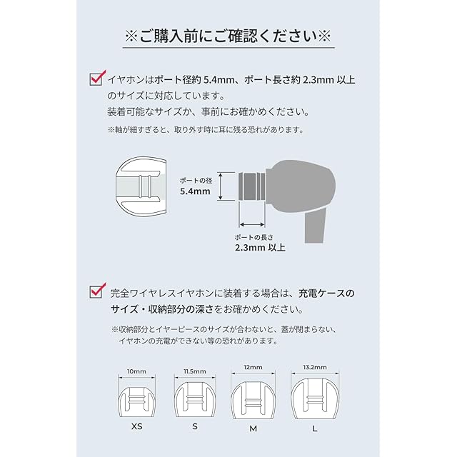 【製品サイズについて】耳の形やサイズによっては装着できない場合や外れやすい場合があります。TWSイヤホンではサイズによってケースが閉まらないこともあります。初めてご使用の際は必ずサイズをご確認いただくか、全サイズ入りセットをご購入いただくと安心です。