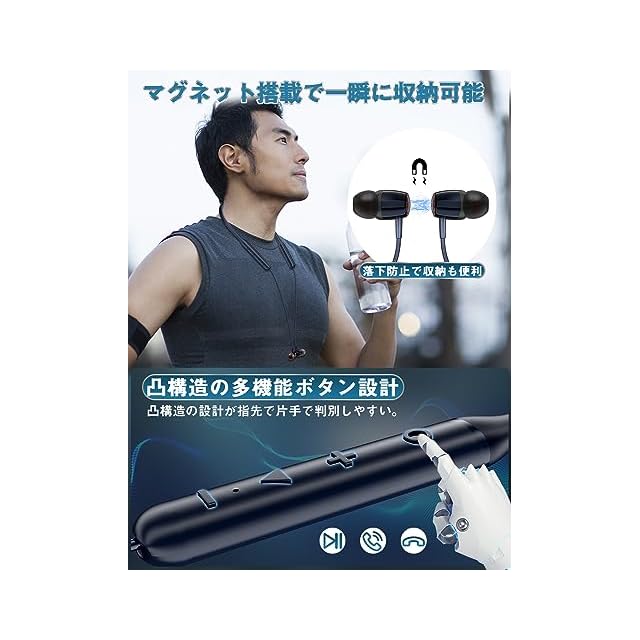 【生活防水・凸構造ボタンで判別しやすい】弊社のBluetoothイヤホンは性能的に防水・防汗性能を備えておくので、ランニング・ジムなどスポーツ時の汗やお風呂の湿気、ワークアウト中の汗と小雨で音楽を聞いたりなどすることに適用します。ランニング中に急な雨に降られても故障のリスクを低減できます。凸構造ボタンで大きくて見なくて指先で判別しやすくなります。コントローラーユニットには四つの機能ボタンが付き、電源ボタン/音量+ボタン/多機能ボタン/音量-ボタン四つであります。マルチファンクションキーを搭載されていることで、ハンズフリー通話や、ボリューム調整、曲送り/戻しを手元で簡単に操作ができます。また、イヤホンを起動してから電源ボタンを一回押すとsiri(音声アシスタント)を喚起することができます。