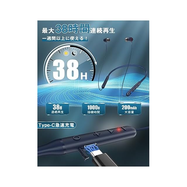 ◆史上最も長い・38時間連続再生ネックバンド型イヤホン登場◆ 【最先端bluetooth5.3チップ・大容量バッテリー】最先端のBluetooth5.3技術を採用されて、接続性がよく安定して、通信スピード、通信範囲とも向上にしました。従来品と比べると高速で移動する際にも、遠距離の空間にも、従来品より「音飛び」や「音切れ」」などの状況も改善できます。省エネルギーの大容量バッテリーがダブル搭載されているため、1回のフル充電で最大約38時間連続再生できて、普通のbluetoothイヤホンより2倍以上実現します。USB Type-C充電が採用されているため、急速充電にも実現可能。わずか10分間充電すると、2時間の程度使える状態になります!通学、ランニング、旅行、出張など長時間の移動が多い方にはおすすめです。WEB会議/テレワーク/通勤通学/運動等の際にも安心してご使用いただけます。(ご注意:再生時間は充電時間、音量調整、再生内容、使用環境、個人使用習慣、接続デバイスなどによって異なる場合があります。)