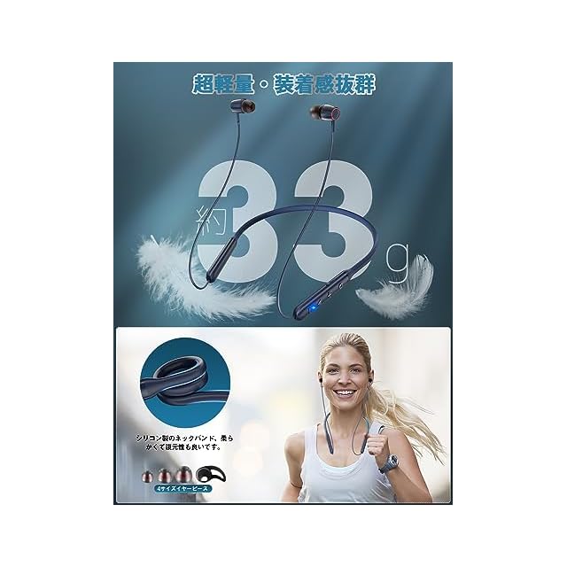 【シリコン製のネックバンド・装着感抜群・マグネット搭載】体に触れる部分が多いネックバンド型イヤホンでは、つけ心地のよさを重視しましょう。弊社のネックバンドは柔らかいシリコン素材で首回りへの圧迫感が少なく良好なフィット感が得られます。ランニング時の使用や長時間使用でも外力に対して変形しにくく、耳から外れにくい構造を実現しました。さらに耳の形は人によってさまざまで、耳に入れるイヤーピースのつけ心地も重要。そのため、交換用のイヤーピースが4セット(S、M、L、M′)を付属してご適用のサイズを選択してください。圧力を削減するため、本体の重さは約33gで軽量設計されているため首にやさしいです。マグネット搭載するので、使わない時はイヤホンを外しても首にひっかけたままにしておけるので紛失防止にも役立ちます。コードが邪魔になりにくいのでおすすめです!
