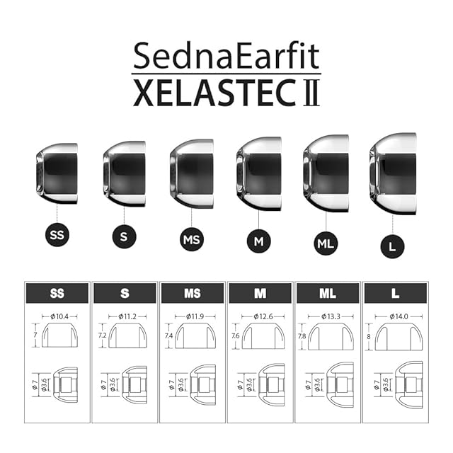 【より多くの方にベストフィッティングさせる6サイズ展開】SednaEarfit XELASTEC IIは、一般サイズのStandardタイプを採用しています。中間サイズを含めたSS/S/MS/M/ML/Lの計6サイズで、より多くの方にフィッティングしやすくしています。また、パッケージング構成は、単品サイズ2ペアと、非常に好評な中間サイズを含めた近接3サイズ(例:S/MS/M)を1ペアずつパッケージングした3ペアの2種類を採用。これにより、左右で耳道の大きさが異なるなどの際、微妙な調整をしやすくなります。さらに最もユーザーニーズが高かった近隣3サイズのMサイズクラスは、MとMSそれぞれを中心にした2タイプのセット商品をご用意し、より選択しやすいようにしました。