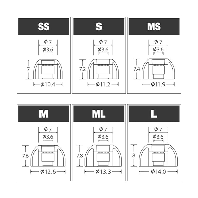 【より多くの方にベストフィッティングさせる6サイズ展開】SednaEarfit XELASTEC IIは、一般サイズのStandardタイプを採用しています。中間サイズを含めたSS/S/MS/M/ML/Lの計6サイズで、より多くの方にフィッティングしやすくしています。また、パッケージング構成は、単品サイズ2ペアと、非常に好評な中間サイズを含めた近接3サイズ(例:S/MS/M)を1ペアずつパッケージングした3ペアの2種類を採用。これにより、左右で耳道の大きさが異なるなどの際、微妙な調整をしやすくなります。さらに最もユーザーニーズが高かった近隣3サイズのMサイズクラスは、MとMSそれぞれを中心にした2タイプのセット商品をご用意し、より選択しやすいようにしました。