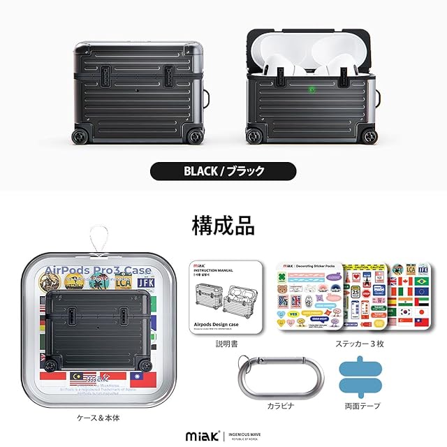 商品名:miak for AirPods Pro 3 用ケース 第3世代対応 キャリーケース [ セパレート構造 耐衝撃二重構造 ポリカーボネート TPU カラビナ付き デコシール同梱 LED表示 スピーカーホール ワイヤレス充電対応 ] MA28160APP3 ブラック 【日本正規代理店品】