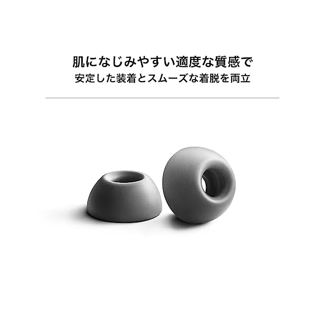 肌になじみやすい、適度にしっとりとした質感に仕上げています。イヤーピースを耳に着ける際は自然に収まり、イヤホン本体が確実にホールドされるため、外れにくく無くしたり、落としたりしがちな完全ワイヤレスイヤホンでも安心です。