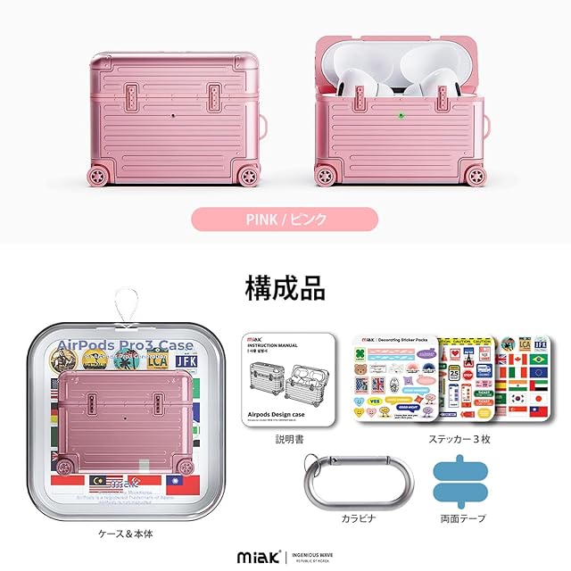 商品名:miak for AirPods Pro 3 ケース 第3世代対応 キャリーケース [ セパレート構造 耐衝撃二重構造 ポリカーボネート TPU カラビナ付き デコシール同梱 LED表示 スピーカーホール ワイヤレス充電対応 ] MA28161APP3 ピンク 【日本正規代理店品】