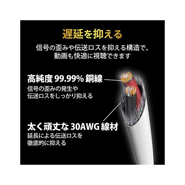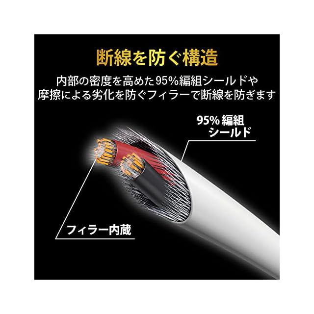 配線内部の密度を高め、屈曲に対する耐久力を強化する95%編組シールドを使用しています。