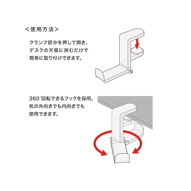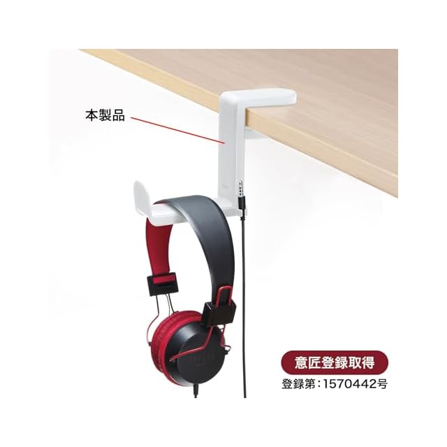 デスクや棚にワンタッチで簡単に設置できるヘッドホンフックです。