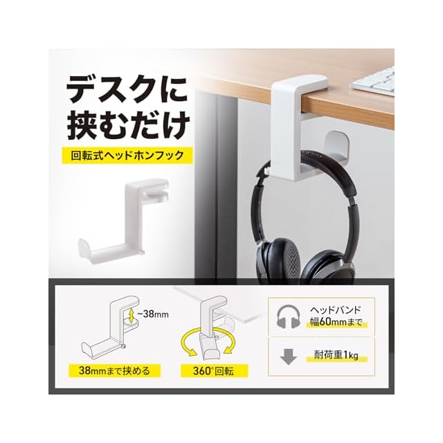 商品名:サンワサプライ ヘッドホンフック 360°回転 バネ式クランプ ホワイト PDA-STN18W