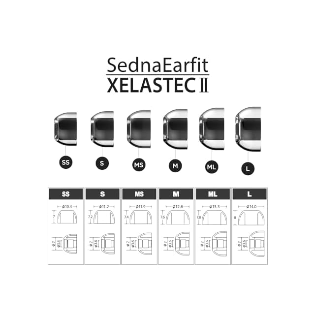 【より多くの方にベストフィッティングさせる6サイズ展開】SednaEarfit XELASTEC IIは、一般サイズのStandardタイプを採用しています。中間サイズを含めたSS/S/MS/M/ML/Lの計6サイズで、より多くの方にフィッティングしやすくしています。また、パッケージング構成は、単品サイズ2ペアと、非常に好評な中間サイズを含めた近接3サイズ(例:S/MS/M)を1ペアずつパッケージングした3ペアの2種類を採用。これにより、左右で耳道の大きさが異なるなどの際、微妙な調整をしやすくなります。さらに最もユーザーニーズが高かった近隣3サイズのMサイズクラスは、MとMSそれぞれを中心にした2タイプのセット商品をご用意し、より選択しやすいようにしました。