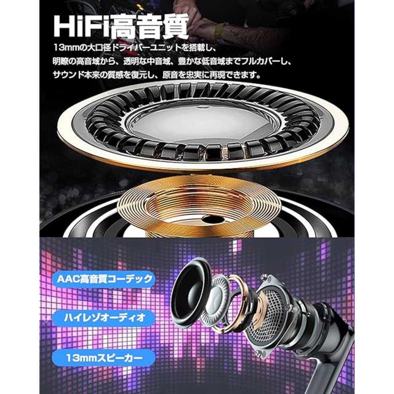 【高音質ドライバー&ダブルマイクENC通話】 13mmの大口径ドライバーユニットを搭載し、明瞭の高音域から、透明な中音域、豊かな低音域までフルカバーし、サウンド本来の質感を復元し、原音を忠実に再現できます。コンサート会場の中にいるかのように、音楽がゆっくりと耳に伝えてくるので、リアルな臨場感で音楽に浸ることができます。ちなみに、高性能マイクとノイズキャンセリングが搭載され、周りの騒音をカットし、自分の発話だけに焦点を当て通話相手にはっきりと伝わるため、通話品質が優れています。