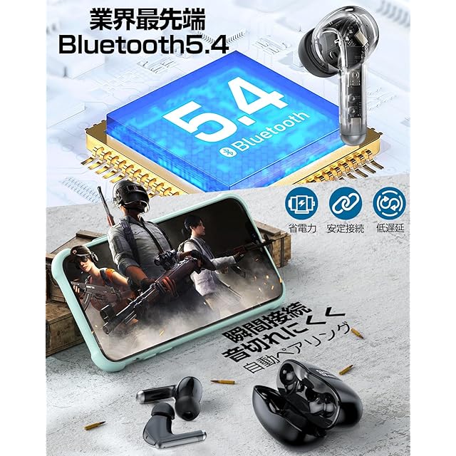 【業界モデルBluetooth5.4技術&低遅延】ワイヤレスイヤホン新型モデルが登場します!!!最新型開発のワイヤレスイヤホンはBluetooth5.4技術とEDRチップを搭載されて、よりクリアに質感、より高速なデータ転送速度、より低電力消費とより安定した接続を実現しました。従来のbluetoothイヤホンの通信なし、音飛び、音切れ、遅延、電力消費早いの問題を改善しただけでなく、満員電車、バスなど電波のある場所でも安定した通信が維持できます。ゲーム中でも、いつでも安定して接続でき、途切れ、遅延などの心配がありません!