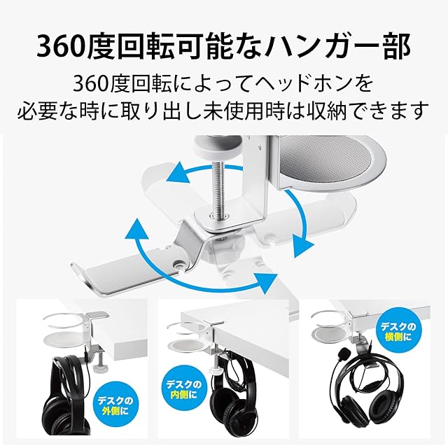ヘッドホンのハンガー部は360度回転可能でデスク下に収納できるので、使用したいときだけデスク下からヘッドホンを取り出すことができます。