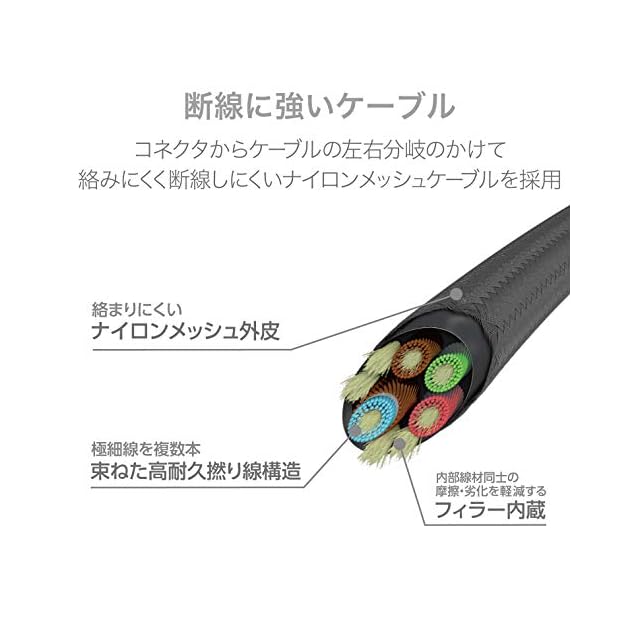 コネクタから左右分岐部分にかけて絡みにくいナイロンメッシュケーブルを採用しています。