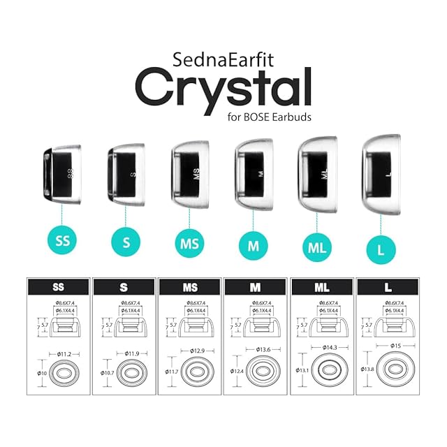 【選びやすい6サイズ展開とセットパッケージ】サイズ展開はSS/S/MS/M/ML/Lの計6サイズ展開。単品サイズ2ペアと、3サイズを1ペアずつパッケージングした3ペア構成、ALLサイズ入りパッケージの3種類を採用。ステージ空間あふれるサウンドと美しく輝くスタイルを持つこのSednaEarfit Crystalは、BOSE製TWSの持つポテンシャルを最大限引き出しつつ、イヤホンの長時間装着や落下などの問題に対しAZLAならではのアプローチで解決します。