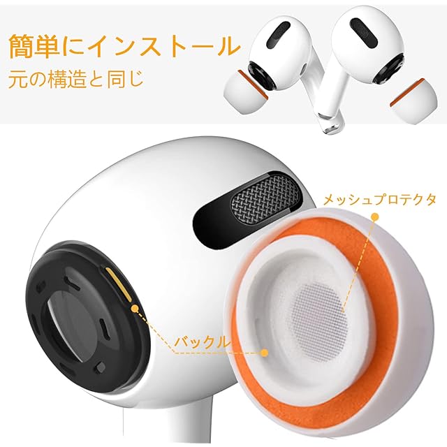 【シリコンカバー+形状記憶素材】AirPods Proの耳栓部分の隙間に形状記憶素材を入れて遮音性を高めよう、と言う感じの改造です。オレンジ色のフォームは一般的な耳せんと同じように形状記憶になっているので少し指で押してから装着して少し待つとフィット感が増します。外側はシリコンのままなのでパッと見は同じですが遮音性はグッとアップします。