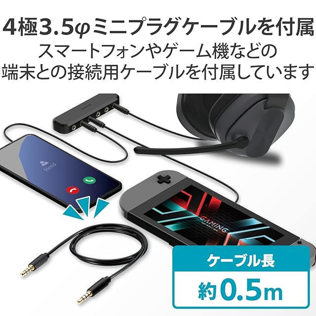 スマートフォンやゲーム機などの端末との接続用4極3.5φミニプラグケーブルを付属しています。