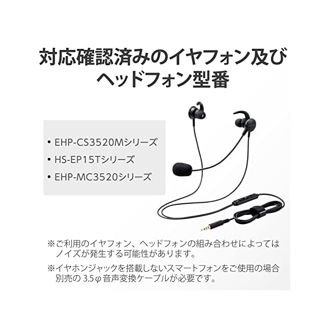 対応確認済みのイヤフォン及びヘッドフォン型番:EHP-CS3520MBK、HS-EP15TBK、EHP-MC3520BK、EHP-CN300MWH、EHP-CS3520MWH ※ご利用のイヤフォン、ヘッドフォンの組み合わせによっては、ノイズが発生する可能性があります。