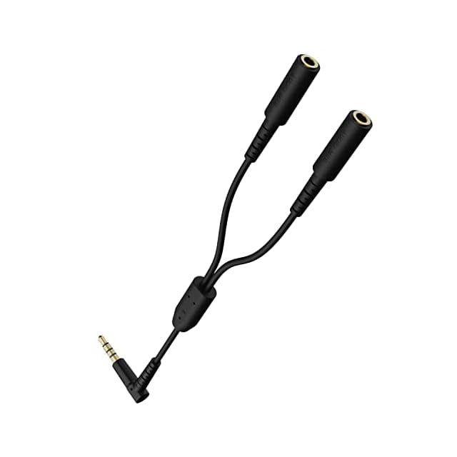 オーディオ出力を2分配できる。1台の端末の音を2つのイヤホンで聴いたり、2人で同時に通話に参加できる4極対応3.5φアナログ分配ケーブル。