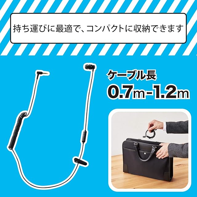 φ3.5mm4極ミニジャックを持つパソコンやスマートフォンに接続し、テレワークやオンライン学習を行うのに適した片耳タイプのカールコードマイク付きヘッドホンです。