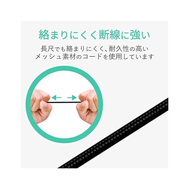 長尺でも絡まりづらく、耐久性が高く断線に強いナイロンメッシュ素材のコードを採用しています。