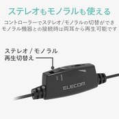 両耳再生機能付きなので、モノラル機器に接続する場合でも、変換アダプタ無しで両耳から再生することができます。